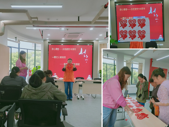 2021年是中国共产党建党一百周年,百年风雨、百年历程,伟大的中国共产党带领我们,开创了一次又一次光辉时刻。为纪念建党100周年,常州开放大学“生活·艺术·家”社区品牌教育项目组应社区党建活动需求,前期项目组在重复调研、研讨的基础上,制定了剪纸艺术讴歌“中国共产党建党100周年”主题活动。2021年5月12日,活动首场,由《剪纸艺术》课程组成员胡妍老师赴红梅街道红西社区开展“一颗红心献给党”主题活动。