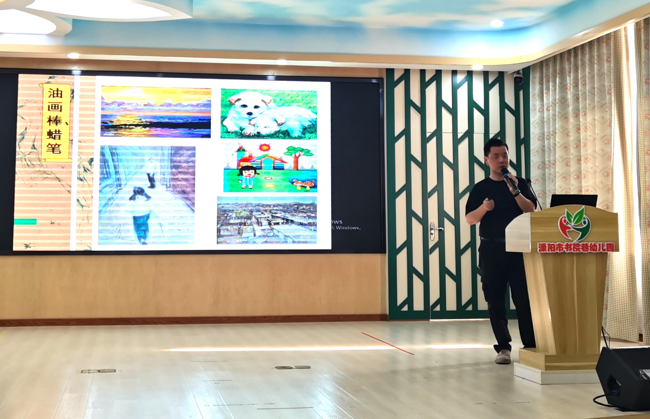 近日常州市溧阳市书院巷幼儿园,邀请常州开放大学社区教育“书画教育”特色项目工作室领衔人潘建忠老师,针对“主题性绘画”创作,为老师们作了专题讲座。潘建忠老师从主题绘画的命题要求、表现方法、材料的运用、绘画的艺术性等方面作了具体阐述,他结合自身的绘画创作深入浅出讲解,和老师一起分享创作的乐趣及独特的见解,大大提升了老师们对主题绘画创作的感受。