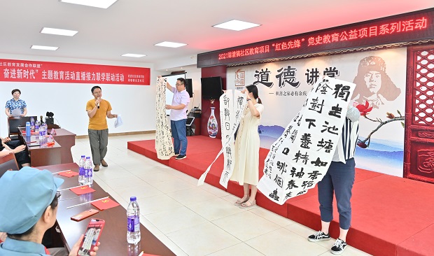 6月22日下午,永定社区开展“红色先锋”党史教育公益项目活动,永定社区瓯香书院书法大师潘杰、唐东进、黄冠仁等带来的献礼100周年的书画展示,通过一幅幅优秀的书法作品,回顾了党的百年历史,讴歌了中国共产党带领全国各族人民通过艰苦奋斗取得的丰功伟业,从书画中汲取红色力量,弘扬红色精神。