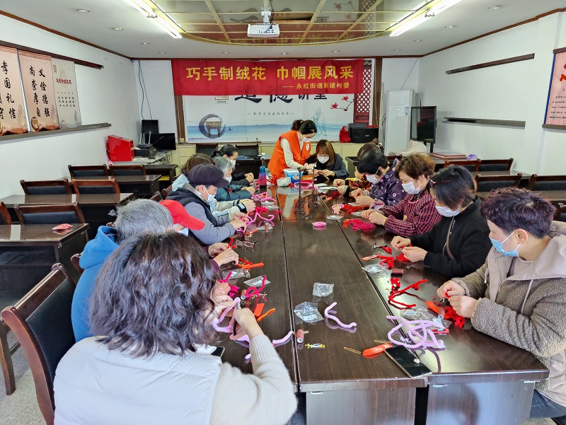 一年一度的三八妇女节即将来临,为了增加辖区女性同胞的幸福感,弘扬民族文化,传承民间艺术,3月4日上午,新建村委特邀常州市龙城小学郑悦老师,在村委二楼活动室开展主题为“巧手制绒花 巾帼展风采”创意手工活动,吸引了不少妇女的参与。