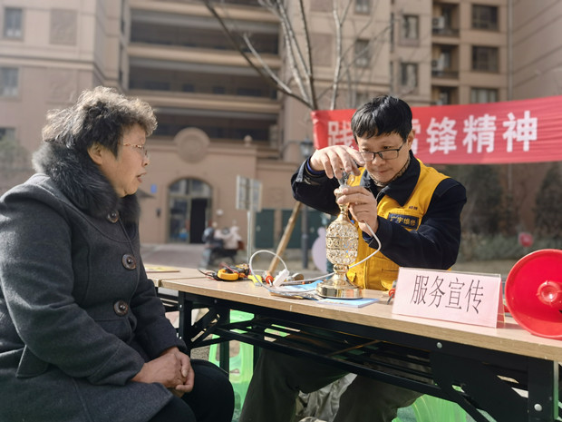 此次活动采取服务进小区的形式,将服务触角延伸到居民家门口。活动现场设有政策咨询、爱心义诊、反诈宣传以及免费家电维修便民服务等多个志愿服务项目。不少居民闻讯而来,针对个人需求进行现场咨询。义诊区,医生们为居民测量血压、提供健康咨询,社区志愿者们为大家耐心讲解服务政策,并就反金融诈骗进行了深入宣传,居民志愿者张师傅利用个人特长为小区居民提供免费家电维修便民服务。志愿者们对居民群众的需求与问题耐心倾听、悉心解答,用热心与真诚传递着为民服务的新时代雷锋精神。