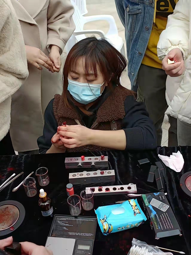 活动一开始,授课老师首先用PPT播放制作口红需要的植物精油来自于哪里、哪些人群可以使用,有什么味道和功效等,然后拿出相应的精油让妇女朋友轮流闻香识别,让妇女朋友挑选好自己需要的精油。紧接着,老师介绍制作个性口红需要用到的其它材料名称和制作步骤,以及需要使用到的模具。最后,在老师的指导下,让大家开始动手制作。