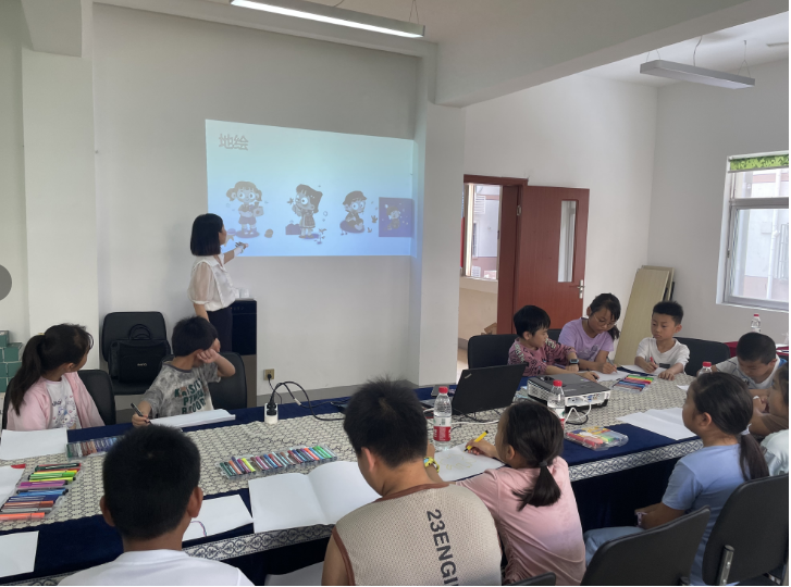 首先,老师先带大家回忆了初次设计构想,发现议事员们对地面改造有很多想法。有契合藤萝摇曳的长廊“绿意盎然”主题,有灵动美丽的“鱼戏莲叶”水墨主题,有表现儿童心怀广大理想的“星辰大海”主题。这一次,由小议事员们构思地绘细节,成为最终定稿。接下来三组议事员根据三个主题,尽情构想画面。“绿意盎然”组设计了藤蔓下小女孩荡秋千的画面,清风拂面,人与自然的和谐之境。“鱼戏莲叶”以水墨为主色调,一大片莲花摇曳生姿,鲤鱼在其间欢快地跳跃,可爱又富有趣味。“星辰大海”组描绘了小宇航员探索浩瀚宇宙的场景,体现孩子们怀抱伟大理想的志向。完成二次绘制后,议事员们又分别上台与大家展示自己的设计理念,希望获得更多人的支持。
