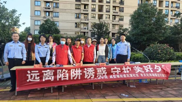 为弘扬尊老敬老爱老的传统美德,增强老年人防骗意识。花溪社区于2023年10月20日,和市文化市场综合执法支队、江苏理工学院共建,在新城和昱文萃苑共同开展“远离陷阱诱惑 守护美好夕阳”宣传活动。