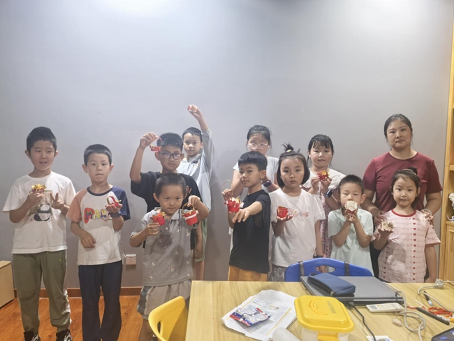 讲座结束后,陆老师还向大家科普了日常生活中的垃圾分类知识,并举例讲解废旧物品的可循环利用性和“变废为宝”的小妙招。之后“变废为宝”的环节中,孩子们在社区志愿者的指导下,展开自己丰富的想象力,利用铅笔和剪刀等工具,原本应该被丢弃的一次性纸杯在孩子们灵巧的手中完成了华丽的变身,组成了“花束”或者收纳篮。