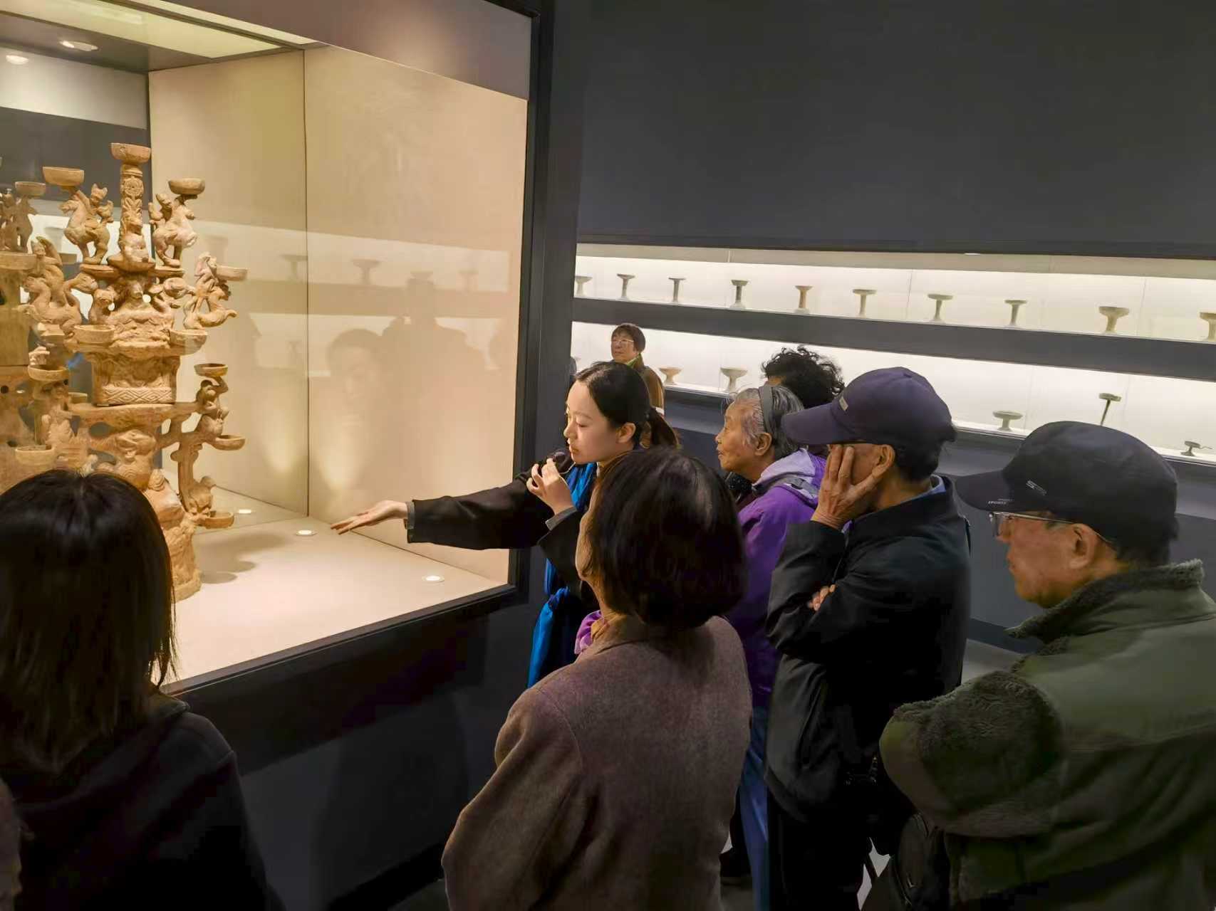 随后,学员们步入雅集园内的油灯博物馆,由金牌解说员引领,众人穿梭于1500余件展现“世界各地油灯”的时光长廊。从远古时期的陶制油灯到近代的铜质灯盏,从东方的青花油灯到西方的玻璃灯器,解说员对每一件展品的年代及背后故事均进行了细致讲解。当众人来到镇馆之宝——西王母油灯前时,老人们纷纷聚拢过来,有人就油灯的造型寓意进行询问,有人对器型演变表示关切,解说员皆耐心地逐一作答。