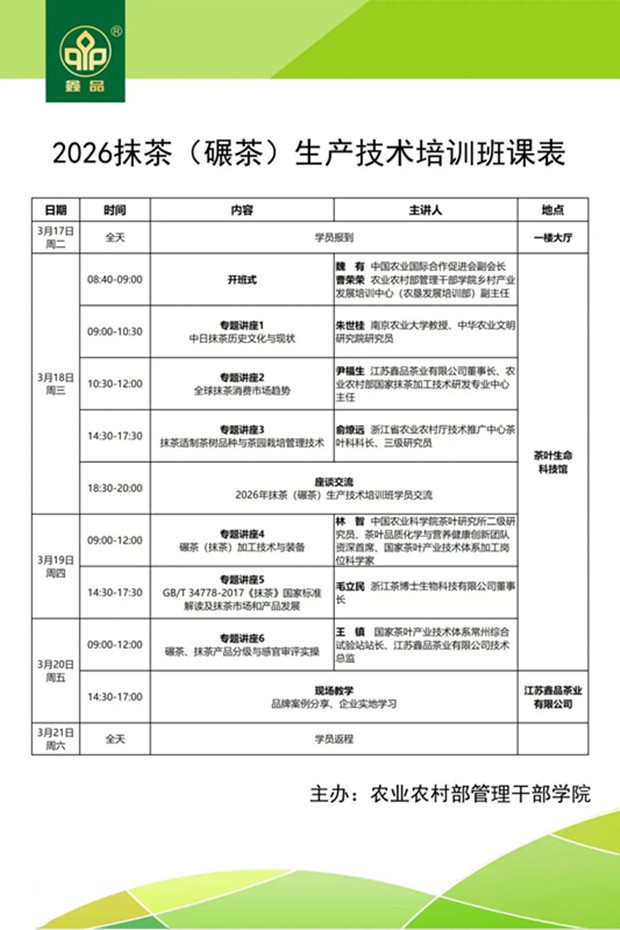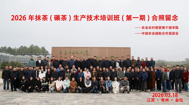 春满茶乡,技领新程!3月18日,由农业农村部管理干部学院主办、中国农业国际合作促进会茶产业分会协办、江苏鑫品茶业有限公司承办的2026年抹茶(碾茶)生产技术培训班(第一期),在常州金坛正式开班!来自全国16个省市区的茶叶主管部门负责人、抹茶碾茶生产企业、产业链上下游从业者及协会会员共102名学员齐聚一堂,共研抹茶产业标准化发展,共绘乡村振兴茶产业新蓝图。此次国家级培训落地鑫品,既是对江苏抹茶产业发展的肯定,更是对鑫品茶业深耕抹茶领域二十余载技术积淀、行业担当的高度认可。