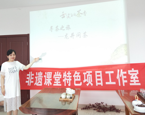 5月22日非遗课堂特色项目工作室成员何丽君老师与金坛中等旅游班的学生进行了一场寻茶之旅——龙井问茶。在舒缓的中国古典音乐声中,何老师以平缓的节奏给同学们传授茶树知识,茶的起源与历史发展,茶的种类,行茶礼仪等知识,展示茶具、介绍茶叶、泡茶、敬茶、品茶的过程。同学们一边观摩练习,一边沉浸在茶文化的艺术氛围里……