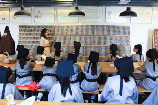 活动中,孩子们穿上汉服,在袍衫襦裙中感受衣冠上国的文化,在博带广袖间参观流传至今老工艺老设备。通过时光印记馆内讲解员的讲解,孩子们了解了活字印刷术和古法造纸术的工艺,通过亲手制作团扇,将自己喜爱的“家风家训”名言诗句印刷在扇面,孩子们感受到了非遗文化在自己手中迸发出新的活力。