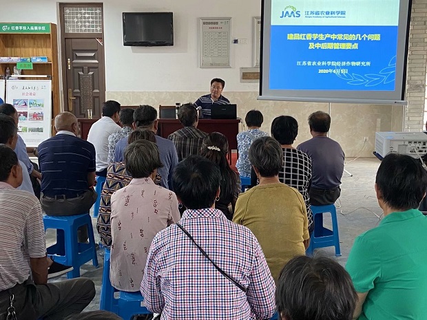 为了更好地提升2020年合作社成员的红香芋产量,在此次培训会,特邀江苏省农业科学院张培通教授以《建昌红香芋生产中常见的几个问题及中后期管理要点》为题,对红香芋中后期管理及安全绿色生产展开详尽细致的讲解。