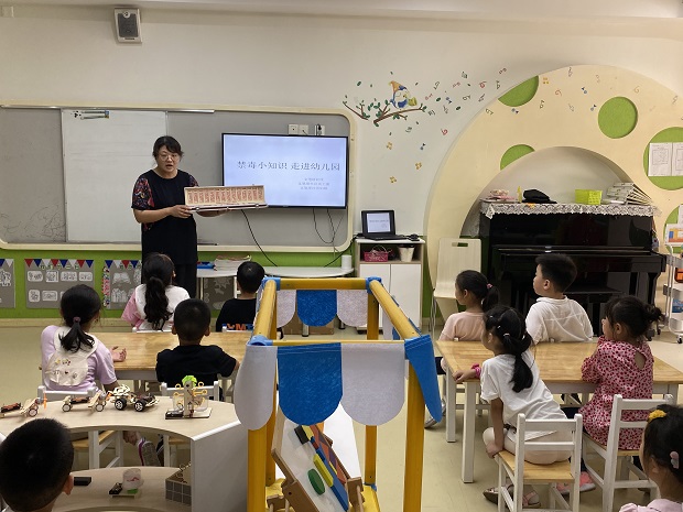 活动中,志愿者利用仿真毒品道具,告诉孩子们,什么是毒品,毒品的种类,毒品的危害性,让孩子们从小对毒品树立起一道防线。关工委工作人员还告诉幼儿园老师,禁毒要从娃娃抓起,首先要提升老师和家长自身识毒、拒毒、防毒和禁毒的能力,树立了拒绝毒品的意识,才能开导孩子懂得只有远离毒品,才能拥有美好的前程,健康的身体和温馨的家庭,从自己做起,大手拉小手,把看到的学到的禁毒知识向身边的家人和朋友进行宣传。