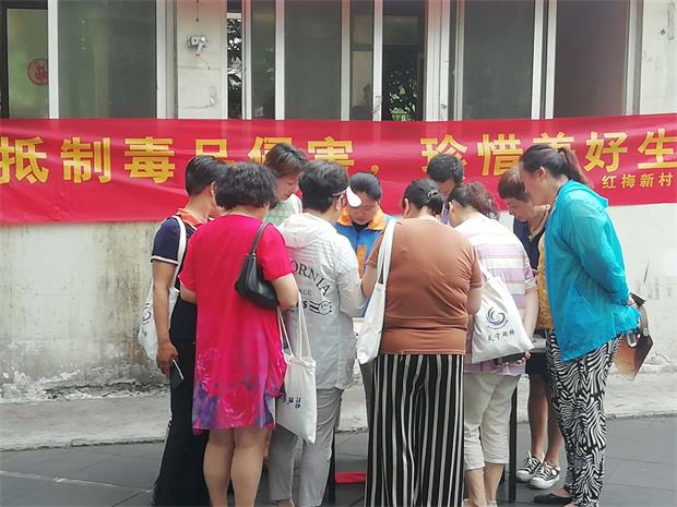 在第33个国际禁毒日来临之际,为全面推进禁毒教育社会化,切实提高社区居民的禁毒意识。6月10日,红梅新村社区在红梅新村文化广场开展了主题为“抵制毒品侵害,珍惜美好生活”的禁毒知识宣传活动。社区工作人员、社区民警及辖区居民等近百人参加了此次活动。