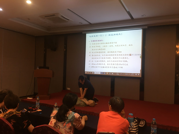讲座由凯旋城社区党总支书记刘淑娟主持,红梅街道卫生服务中心主任医师张益平主讲。张主任围绕意识散失如何识别、做心肺复苏的注意事项和方法步骤等进行了讲解和演示,并现场进行了心肺复苏的实操培训。现场气氛热烈而轻松,大家表现出浓厚的学习兴趣。实践演练环节使整个会场氛围达到了高潮。