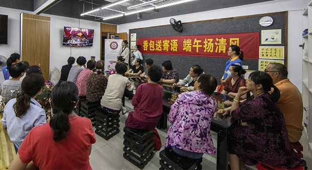 活动分为三个步骤,第一阶段先从讲述《史记》中屈原的故事开始,并诵读了屈原所写的不朽诗篇《离骚》,展现了屈原的清正廉明,和他的远大理想及爱国情怀。第二阶段由老师身穿汉服,为大家展示汉文化的礼仪精髓,在场居民纷纷参与其中,学习传统礼节礼仪。第三阶段,做香包送寄语活动,大家在亲手缝的香包上挂上了为孩子、朋友、邻里送出的寄语卡片,有的写着“莫道君行早,更有早行人”来送给自己的小孙子,希望孩子可以珍惜时间,好好读书。社区居民王阿姨就写了“人而无信,百事皆虚”来告诉自己创业的儿子,做人行事一定要有诚信可言,这才是立身之根本。