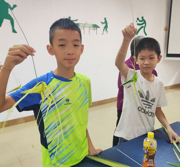 半个小时后,孩子们第一个亲手制作的棕编蚱蜢就完成了,在编制中,我们仿佛与千年前的民间艺人来了一场时空对话,让每一位孩子与传统的技艺更加接近。(常州市武进区湖塘镇东方社区 季鸣)