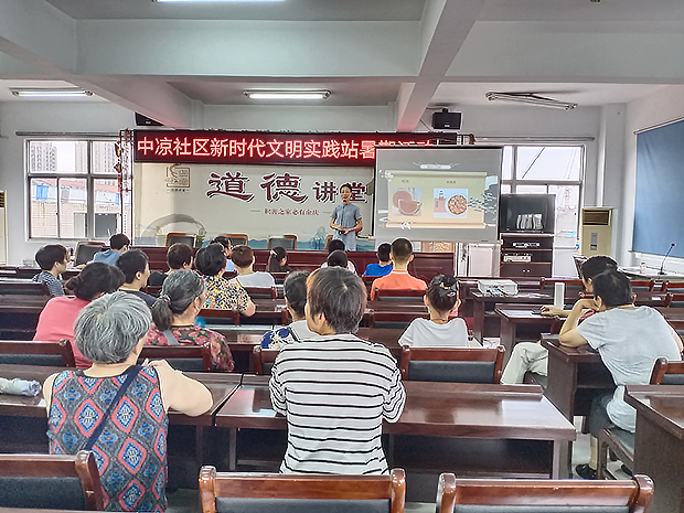 8月8日上午9点,讲座准时在中凉社区居委会四楼综合活动室展开。许西惠老师通过几则家庭悲剧的新闻开始了讲座,许多家庭悲剧的产生都是因为礼的缺失。人无礼不生,事无礼则不成,国无礼则不宁,从西周起,礼仪便成为立国纲要,被视为“国之大柄”。许老师通过《文王拉车》、《打金枝》、《糟糠之妻不下堂》、《孟子休妻》、《扇枕温席》等典故生动的讲述了在家庭中,小辈对长辈的孝是礼的表现,长辈对小辈的正确引导也是礼的表现;孩子对父母要做到“出必告,反必面”,长辈在家庭关系中要起正面作用,才能使家中有礼,家庭关系和谐。