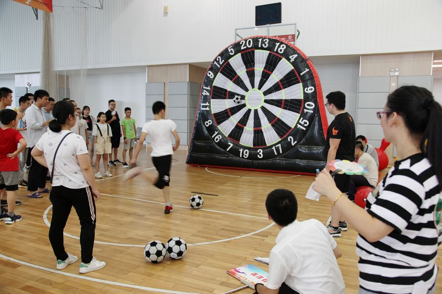 随着开场节目的结束,在场运动员以各自社区为单位自觉分好了队伍,场上鸦雀无声静待裁判讲解着比赛规则并宣布比赛开始。只听裁判的一声哨声比赛正式开始。第一项就是最受欢迎的毛毛虫竞赛,只见场上准备了3条大型毛毛虫,每个社区各派4组家庭驾驭一条毛毛虫,尽管有人摔倒也丝毫没有影响到一个队伍的比赛,家长和孩子们骑着毛毛虫齐心协力共同前进,拼尽全力向前跑;第二项是脚踏实地,队伍分为大人队和小孩队,只听哨声响起,小朋友们穿着‘大脚’奋力奔向各自父母传递‘大脚’,巨大无比的“脚”使大小运动员们不得不脚踏实地,一步一步向前跑;第三项是飞镖投掷,大大的一个充气圆盘放在场中间,为了趣味性更高,投掷的飞镖也换成足球,运动员内藏龙卧虎,每个队中都藏着足球高手,投出的环数高的不可思议。场内运动员们比赛的如火如荼、场外的啦啦队加油声也一浪高过一浪,整个比赛激情澎湃。历经半天的比拼青阳社区的运动员们最终获得了第一名,获得名次的运动员们在欢呼,没获得名次的也十分开心,经历了一场比赛,大家似乎已将输赢名次抛之脑后,激情和精彩的比赛记忆成为了参赛人员最大的奖励。