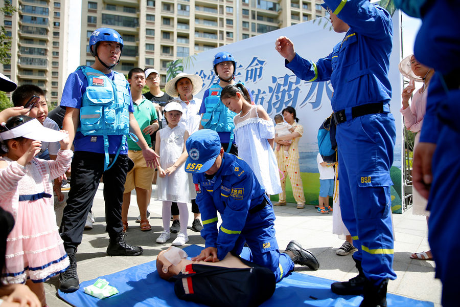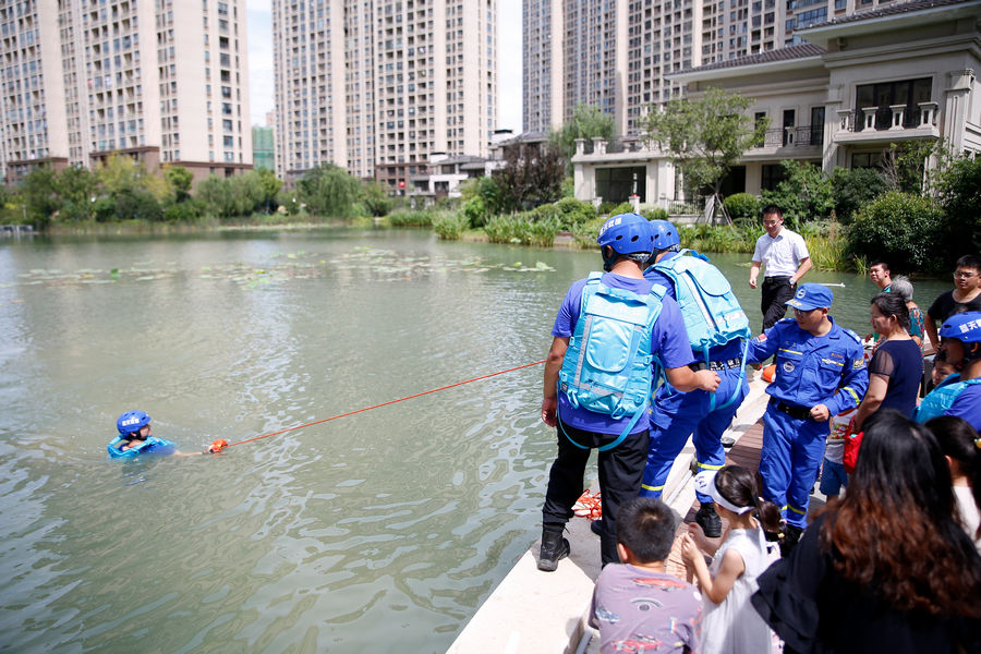 活动当天,由蓝天救援队的田辉队长为来蔚蓝天地党建阵地参加活动的居民讲解有关防溺水的相关知识。课堂上田队长与居民热情互动,时而爆出几句金句,引得居民哄堂大笑;时而鞭辟入里,引得居民细细品味。30分钟的讲解很快就结束了,大家仍然意犹未尽。随后在田队长的带领下,居民来到蔚蓝天地人工湖,观摩今天活动的重头戏,现场实操演练。只见身材健壮的救援队员,跳入湖中扮演溺水者,田队长则在岸上为居民演示施救方式和细节。居民不时提问,田队长也一一解答。炎热的天气阻挡不了大家的热情,活动也到了最后的环节,由救援队的女队员为居民示范对溺水人员的抢救,女队员一边讲解一边施为,随后又邀请3位居民现场操作。活动时间虽然不长,但到场的每位居民都受益匪浅,最后在大家的热情中结束了今天的活动。