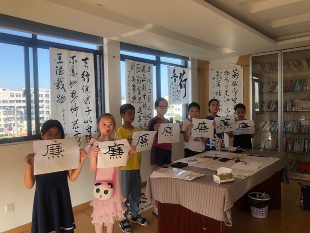 村委工作人员通过带领同学们玩游戏,让彼此不熟悉的小朋友更迅速地融入环境,促进彼此感情,敞开心扉;通过领读朗诵诗《祖国,我爱你》让同学们更加了解新时代中华民族的伟大梦想、伟大事业,增强爱国意识,引导他们树立远大理想,做一个有目标、有理想的有为青年;通过书法写“廉”环节,为他们讲述“廉”字的深刻含义,向他们传递“廉”是中华民族传统美德以及中华民族传统文化的重要组成部分。倡导清正廉洁,“达则兼济天下,穷则独善其身”的立身准则。同学们纷纷表示今后要光明磊落,不索取,清清白白做人。