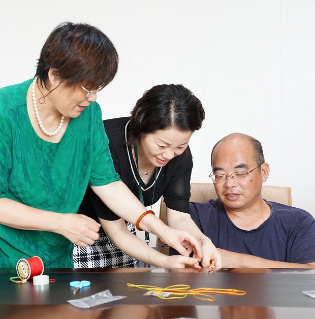 8月24日,常州工学院艺术与设计学院郭琰老师来到新闸街道现场授课。在郭老师的耐心指导下,参加活动的“爱相汇”工作室成员们学会了如何平结、雀头结等中国结艺中的基本编结的方法,并且学会运用这些技法编织不同的图案效果。