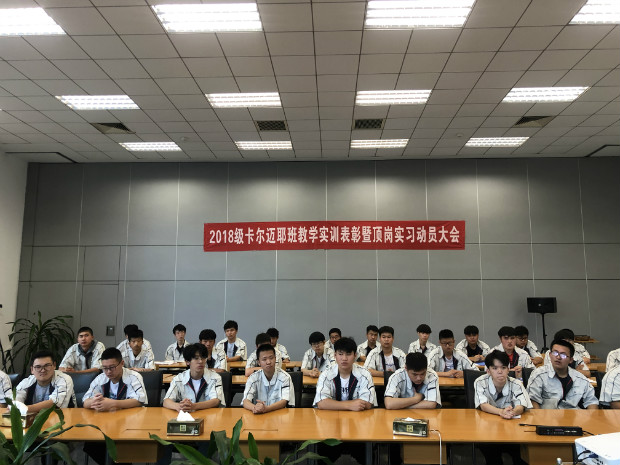 最后,2018级卡尔迈耶班全体学生对着国旗进行实习宣誓:立足专业,追求卓越,争做工匠精神的传承者; 勤学苦练,技能精湛,争当工匠队伍的排头兵。