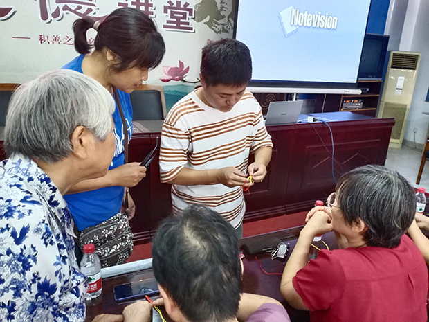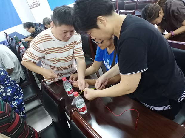 活动在9月8日下午2点准时开始,本课将教会居民们编最简单的平结手链。朱东斌老师简单介绍了一下手链编织的工艺,播放了编手链的教程,随后拿起社区工作人员准备好的绳子开始仔细的讲解平结的编绳方法,有些居民阿姨是第一次接触编绳,看了几遍没学会,朱老师就一个一个,手把手耐心仔细的教他们编,不多一会儿陆陆续续有阿姨学会并编了一小段。半小时后,朱老师看大家都编得差不多了,就开始教阿姨们怎么收尾,剪掉多余的线,用打火机烫一下线尾,再取一段线,对折成一长一短,后用长线顺着中间的绳子逆向缠绕,塞进对折线的线圈中,抽紧短线做成手链的松紧结,剪去多余部分并烫线头,收尾就完成了,一条完整的平结手链就完成了。