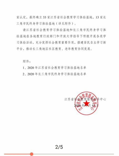 根据《长三角地区社区教育、老年教育协同发展三年行动计划(2019-2021 年)》、《关于开展长三角市民终身学习体验基地创建工作的通知》和《关于开展 2020 年江苏省社会教育学习体验基地创建及长三角市民终身学习体验基地申报工作的通知》要求,江苏省社会教育服务指导中心组织开展2020年江苏省社会教育学习体验基地及长三角市民终身学习体验基地创建工作,我市各镇(街道)社区教育中心在前期溧阳市中小学生研学旅行基地、常州市游学基地、江苏省游学基地建设的基础上,积极申报,经层层筛选,专家认定,最终确立,上兴镇社区教育中心申报的“曹山紫竹林盆景园艺学习体验基地”为2020 年江苏省社会教育学习体验基地,竹箦镇社区教育中心申报的“新四军江南指挥部纪念馆”为2020 年长三角市民终身学习体验基地。