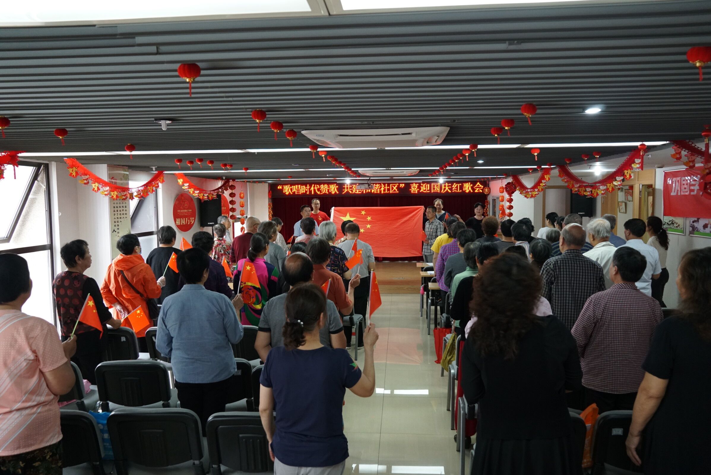 活动现场,参会党员及群众满怀热情,整个活动现场红旗飘动、歌声激昂。社区四支部书记潘琴给大家演唱了《没有共产党就没有新中国》,社区清靓合唱队队长卜红带领队员合唱了《东方红》,社区全体社工演唱了《我的祖国》,多首歌颂祖国、歌颂党、歌颂新时代的歌曲轮番上阵,赢得观众的阵阵掌声。活动最后在全场合唱《义勇军进行曲》中拉下帷幕,大家挥动着手中的国旗,表达对祖国的热爱。