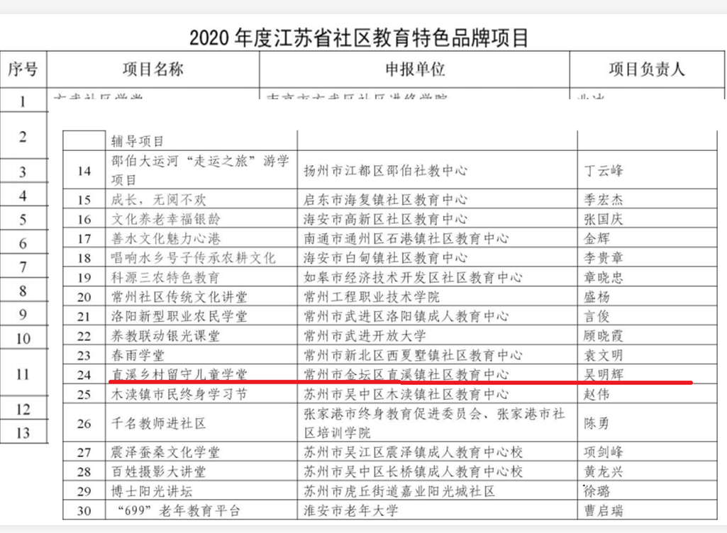 近日,江苏省教育厅发布《省教育厅关于公布2020年度省社区教育特色品牌项目和省老年教育学习资源库子库项目入选名单的通知》(苏教继函[2020]2号)中,由直溪镇社区教育中心主持建设的“直溪乡村留守儿童学堂”社区教育特色项目成功入选2020年度省社区教育特色品牌项目(该项目为金坛区首次入选)。