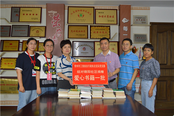 10月8日上午,来自常州市工信综合行政执法支队党支部书记朱云中率志愿者一行4人来到锦阳花苑社区,开展结对爱心图书捐赠志愿服务活动,为社区居民送去“文化知识大餐”。