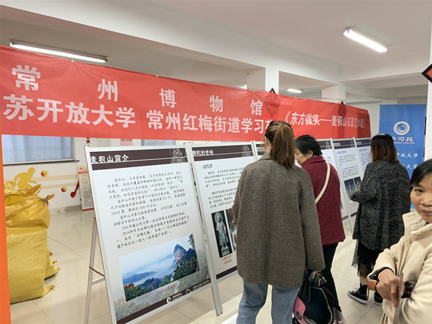 为丰富居民的精神文化生活,2020年10月13日至2020年10月16日,红梅街道学习苑虹景社区学习点联合常州博物馆在居民学校举办了“东方微笑——麦积山石窟艺术展”。