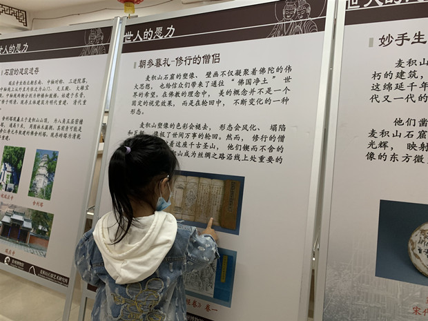 麦积山石窟是世界文化遗产,自开展以来吸引了众多辖区居民共同欣赏。此次艺术展主要以展板的形式向居民们展示了麦积山石窟各历史时期“佛陀的世相”雕塑精品,以时间为线索,反映其艺术特征和风格演变。一张张展板上的泥塑图像姿态、神情各不相同,栩栩如生,深深吸引了大家的眼球。许多家长带着孩子来到居民学校,一起感受世界文化遗产的文化底蕴和独特的艺术魅力。
