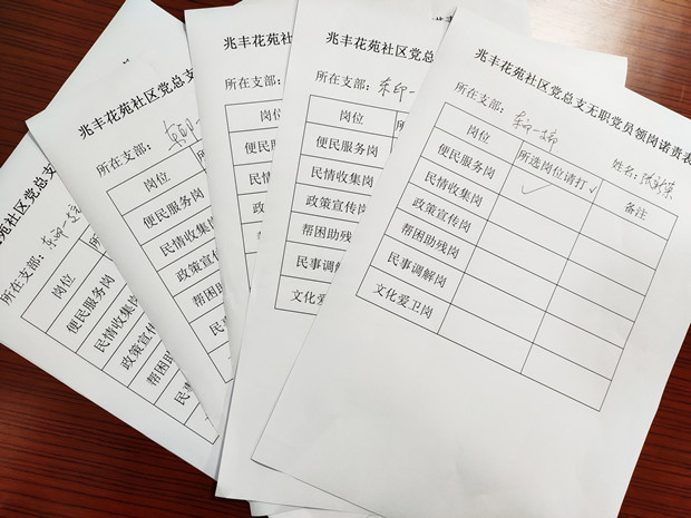 社区党总支根据本社区实际情况,设立了6个岗位,分别是:便民服务岗、民情收集岗、政策宣传岗、帮困助残岗、民事调解岗、文化爱卫岗。活动现场社区党总支书记束颖向在座党员详细介绍了天宁街道下发的《关于规范无职党员领岗诺责加强党员模范作用发挥的实施意见》,社区的无职党员们结合自己的年龄、特长、文化程度、身体状况主动认领岗位并进行书面承诺、领岗诺责。今后将形成广大无职党员申岗承诺、领岗晒诺、立岗履诺、评岗议诺,“岗”“责”相融的良好局面。