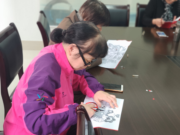 阿姨们熟门熟路的挑选自己喜爱的图案,戴上老花眼镜,有模有样的拿出剪刀,观察图形,调好坐姿,耐心的一点点开剪。工作坊里不时的传出欢声笑语,阿姨们聊聊家常,谈谈心事,好不热闹。(常州市武进区湖塘镇东方社区 季鸣)
