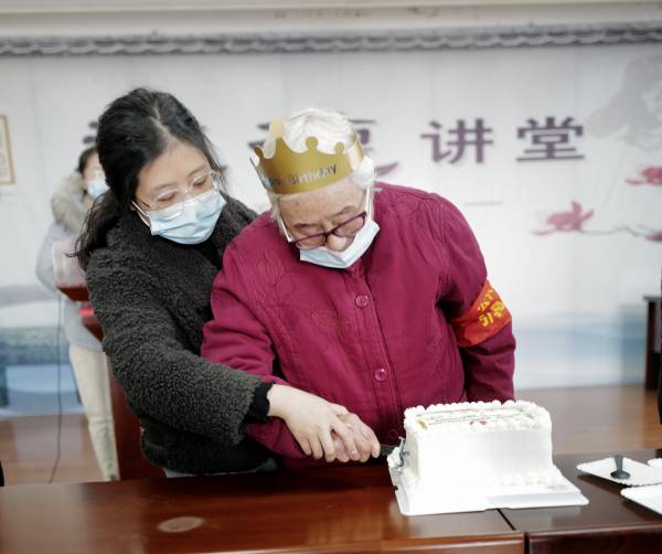 在83岁社区志愿者王宝芬的“光荣退休”欢送会上,数十位社区志愿者和居民代表聆听了王奶奶长年热心公益事业,为社区居民义务巡逻,保一方平安的感人故事。河苑社区特意为王奶奶定制了“不忘初心 银发志愿”的纪念蛋糕,以感谢这位高龄志愿者为社区的辛勤付出。