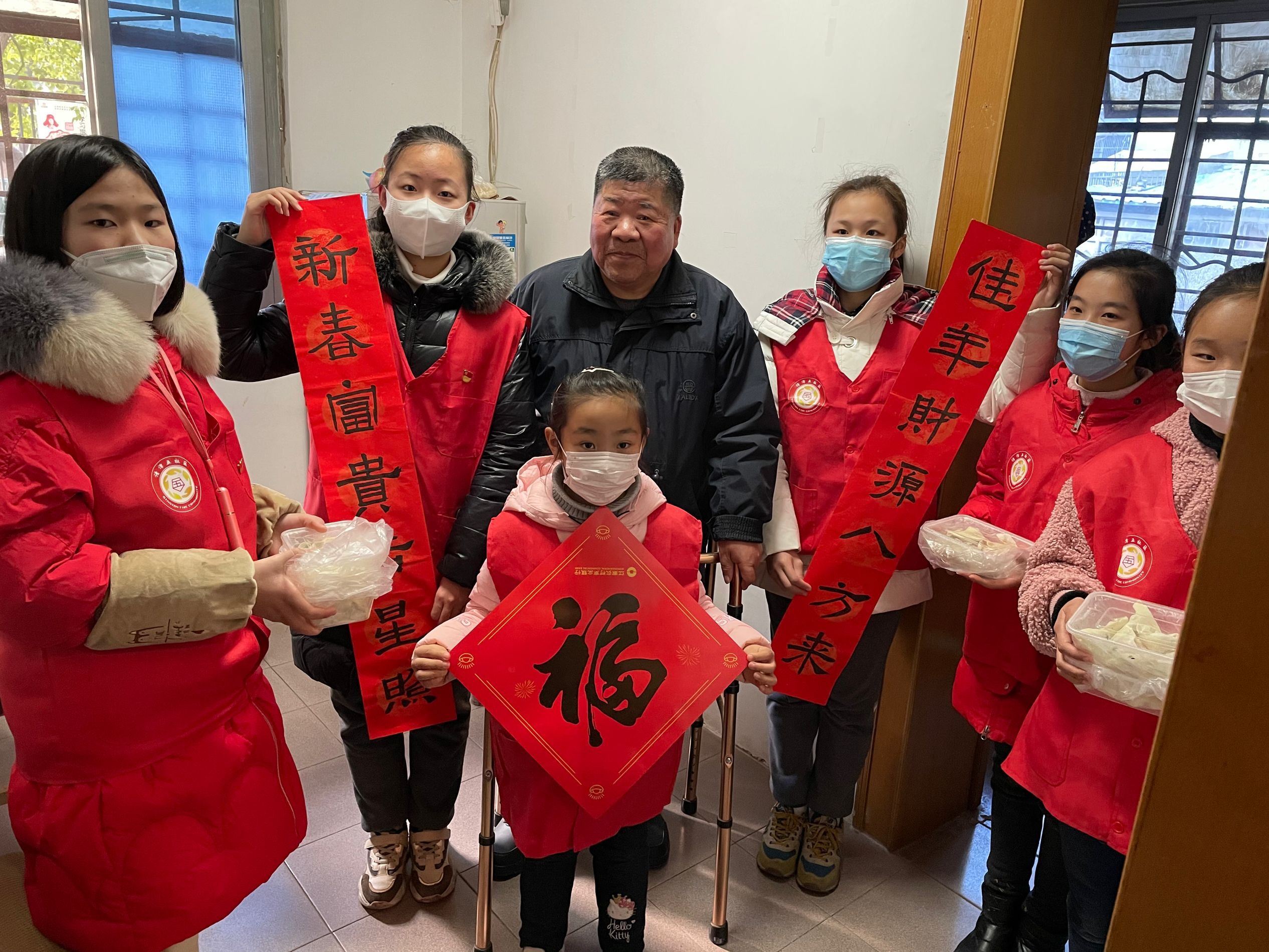 这些小志愿者们大多来自社区附近的清潭实验小学,也有社区工作人员的子女。他们虽然年纪小,做起志愿服务来却热情高涨。有的小志愿者早早来地到社区大门“站岗”,为进进出出布置写春联活动场地的工作人员拉门;有的小志愿者耐心地站在写春联的台子旁帮忙按住春联,以免被风吹跑;有的小志愿者忙里忙外地打下手,负责将写好的福字递给工作人员高高地挂在广场上......小志愿者们还加入了社区的“拜年小分队”,跟随网格员、楼栋长和党员志愿者们挨家挨户去慰问空巢老人、低保家庭、失独家庭等社区困难户以及“就地过年”的家庭。每到一处,小志愿者们都送上自己真挚的新春祝福。当充满希望的童声响彻一间间旧屋子,老人们的脸上露出了灿烂的笑容。
