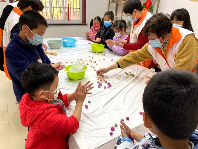 张灯结彩的社区民俗活动室一派热闹景象,辖区青少年和社区志愿者一起挽起袖子,榨蔬果汁、揉面团、搓汤圆,随着一双双巧手的搓转,一枚枚五彩晶莹的元宵很快就摆满了盘子。在制作元宵过程中,志愿者还普及了元宵节的来历及其文化习俗,大家不但享受了制作汤圆的乐趣,还体验到了传统文化的魅力。