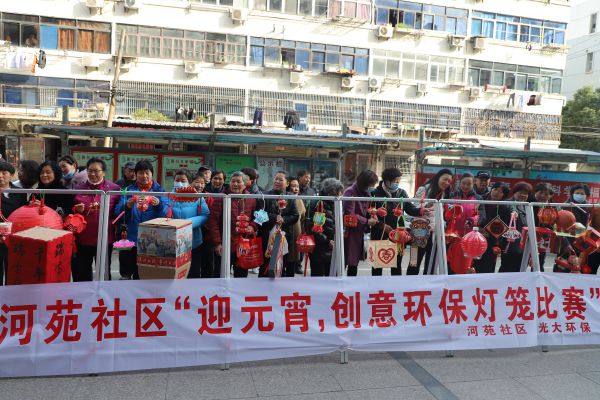 2月23日河苑社区联合光大环保开展“迎元宵创意环保灯笼比赛”。当天,居民和学生制作的100盏创意环保花灯展,把社区扮靓一新。今年是牛年,各种材质与造型的牛形灯,充分展示了居民和学生的智慧。丝网花、毛线、废旧纸盒、废弃饮料瓶、气球,都成了制灯的材料;现场的环保花灯造型足有近百种,荷花、廉灯、房灯、鸟巢、兔灯……让人目不暇接。这些花灯创意新、制作巧、趣味足,十分别致。
