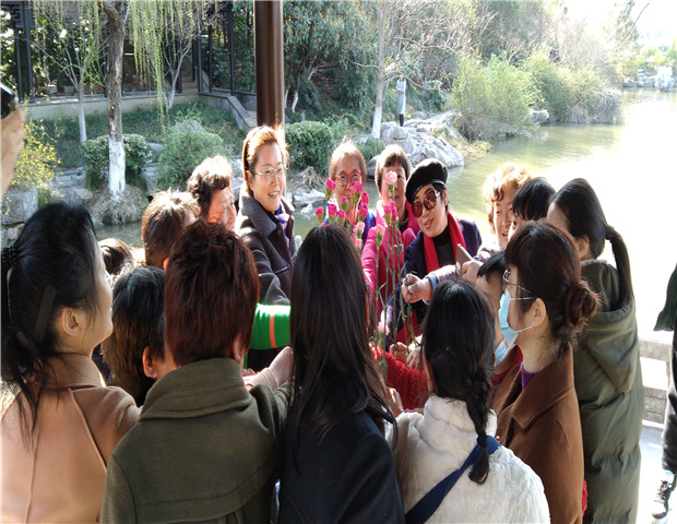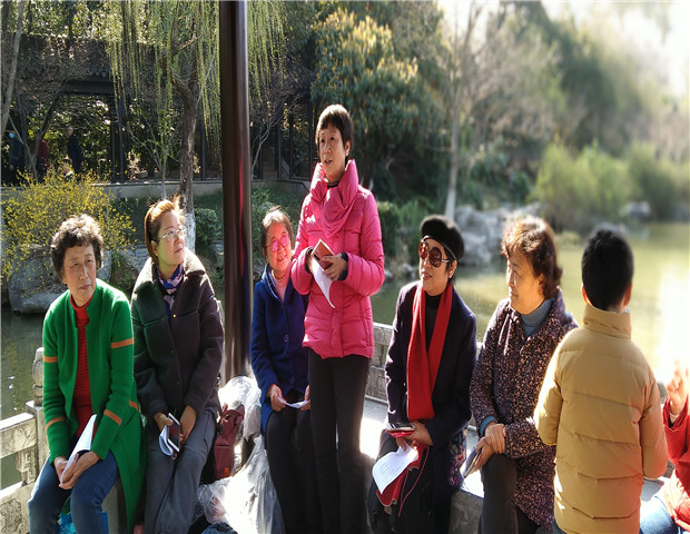 3月2日下午,在红梅公园里,社区妇女们在巾帼志愿者的陪同下,边走边聊,边赏红梅。大家围坐在亭里,一起做“贴心牵手,认识彼此”、“红梅公园,与谁同行”的小游戏,用语言、动作介绍自已的名字,分享第一次来公园与谁同行,大家在游戏中彼此认识和熟悉起来。
