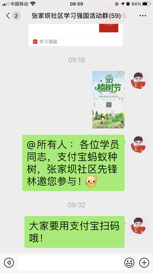 疫情防控常态化下的植树节,张家坝社区发起了“种植社区先锋林”线上云植树活动。邀请社区居民在支付宝蚂蚁森林平台虚拟种树,合种“张家坝社区先锋林”。网络种树形式既传承了植树节传统,又符合当下互联网 万物的时代潮流。不仅能够适应当下的快节奏生活能,还激发人们植树造林的热情,意识到环境保护的重要性。一起参与云上种树的社区居民可能没有见过面,但我相信大家的情谊会随着这棵虚拟树枝繁叶茂、开花结果。