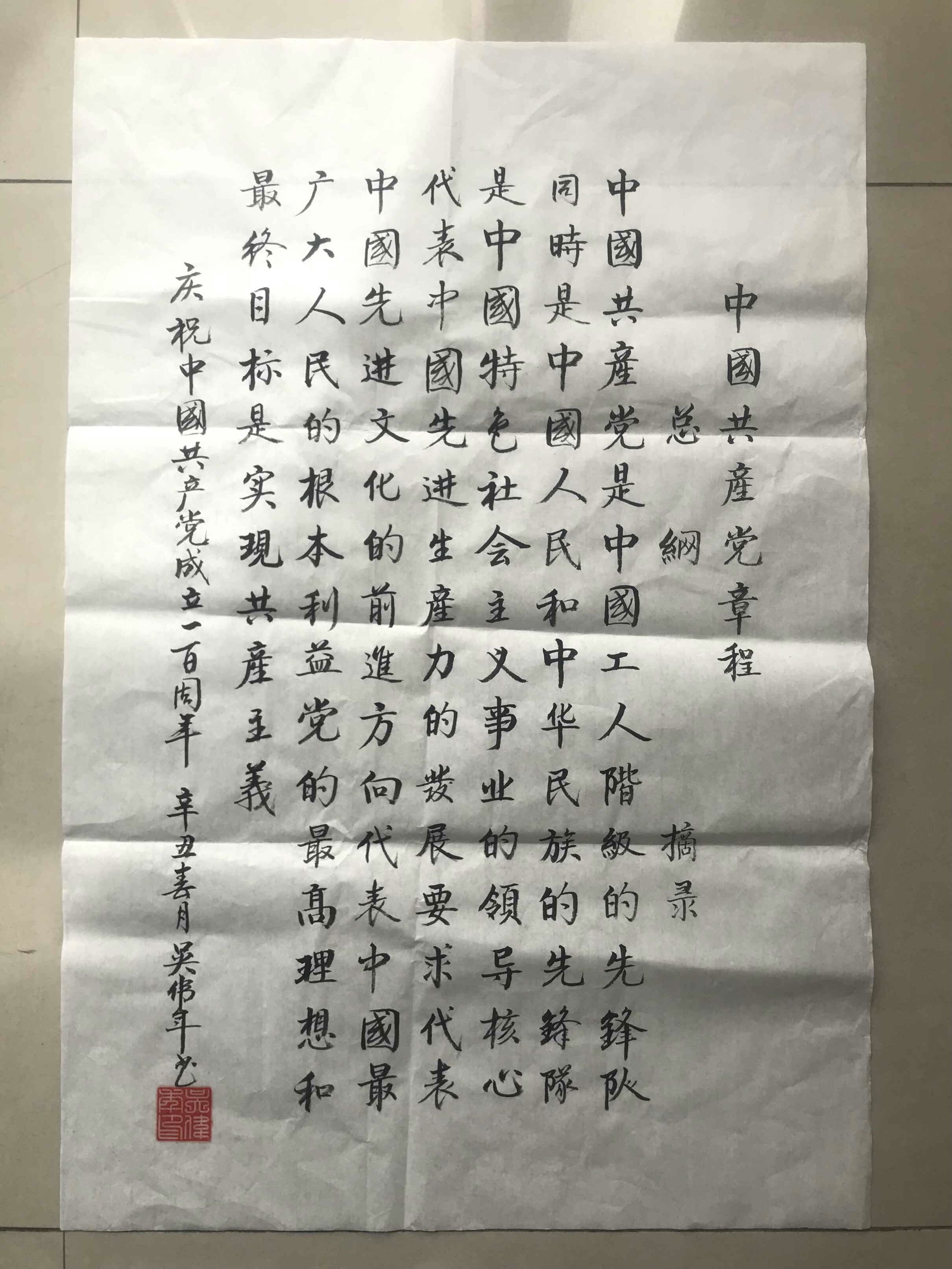 4月14日上午,86岁高龄的社区党员吴伟年爷爷来到社区,向党总支缴纳2021年的党费,并送来亲手书写的《中国共产党章程总纲》,以书法的形式表达对社区党总支的感谢,并借此抒发自己对祖国的深爱之情和美好祝愿。
