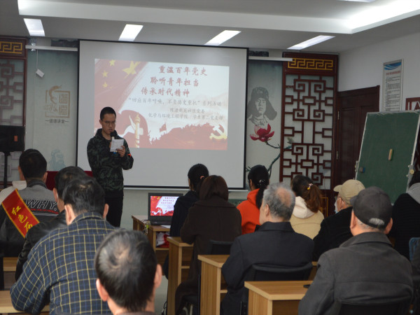 4月15日在陈渡新苑社区道德讲堂内,青年党员和老龄党员们齐聚一堂,重温百年党史,传承时代精神。