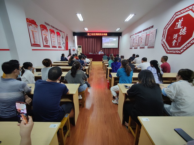 讲座上,常州安宣应急技术有限公司的陈波教官向大家播放了火灾视频,讲解了火灾发生的规律,特点及其危害性,同时向参与讲座的居民和商户业主传授防范措施和火灾初期扑救方法、以及人员疏散、火场逃生方法等知识。