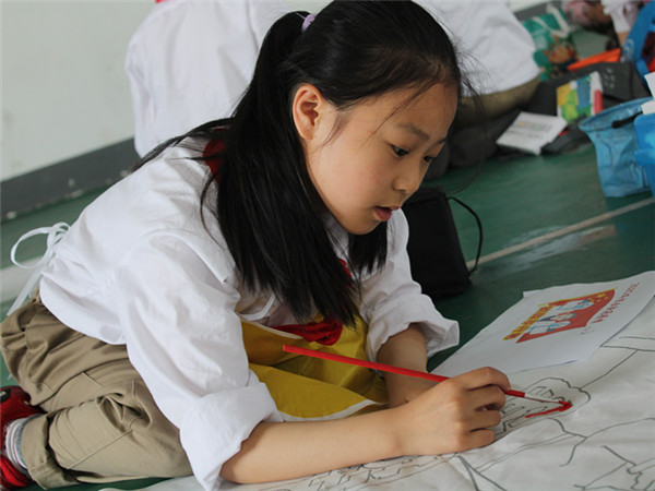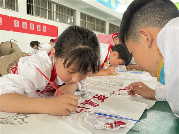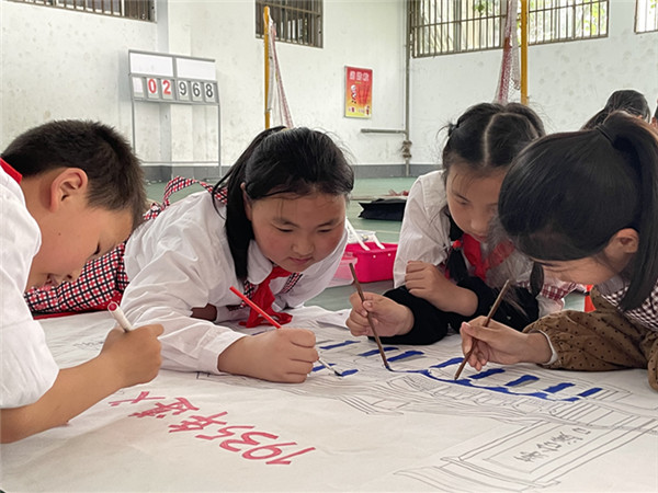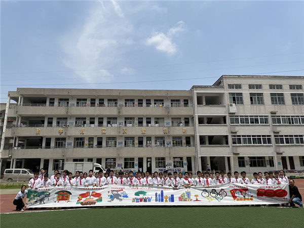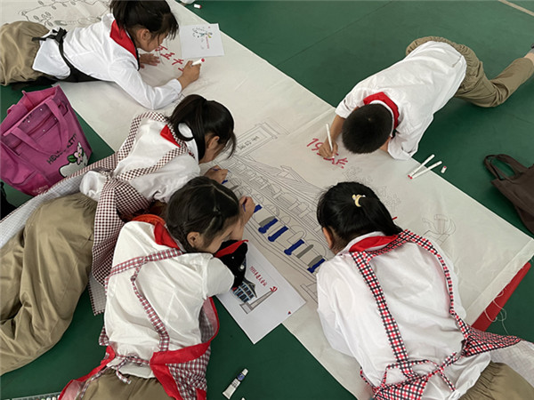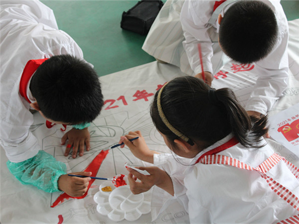活动现场,一幅二十米的画卷在场地上徐徐展开,五十名小朋友分成18个小组,每组负责一幅历史场景。同学们手拿各色颜料或蹲或坐或趴坐在长卷上认真作画,时间在画笔上悄然流逝,每一个孩子都聚精会神,用巧手描绘出了壮丽的党史画卷,画卷以线条与色彩勾勒出了百年的成就与辉煌,再现了从1921年建党到2021年一百年的党的奋斗征程。从中国共产党成立、红船精神到红军长征,从抗日战争到解放战争,自新中国成立到改革开放,包括北京奥运、抗击疫情等18个著名历史事件场面,将党的关辉历史以春风化雨的形式植入小朋友们的心田,对传承革命精神,厚植爱国情怀,帮助学生树立正确的世界观、人生观、价值观具有重要的教育意义。