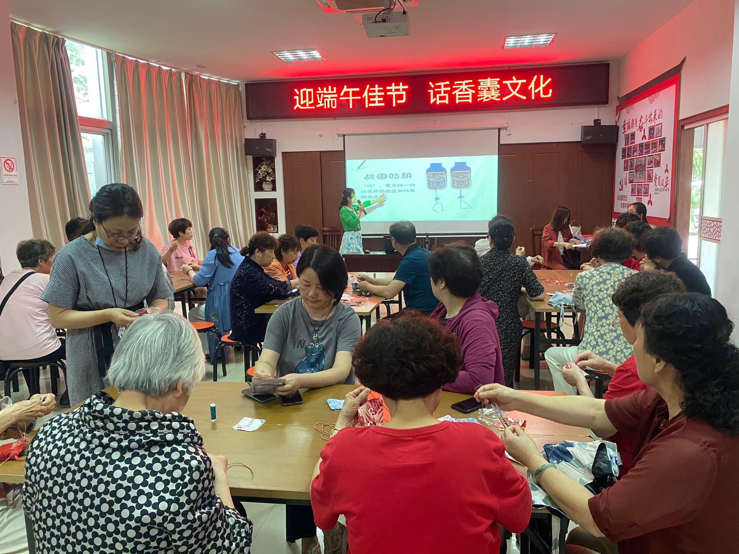端午佳节来临之际,为丰富辖区居民的文化生活,弘扬和传承传统文化,怡康花园社区邀请常州开放大学副教授吕颖为居民们讲解香囊文化,并现场传授香囊的制作。