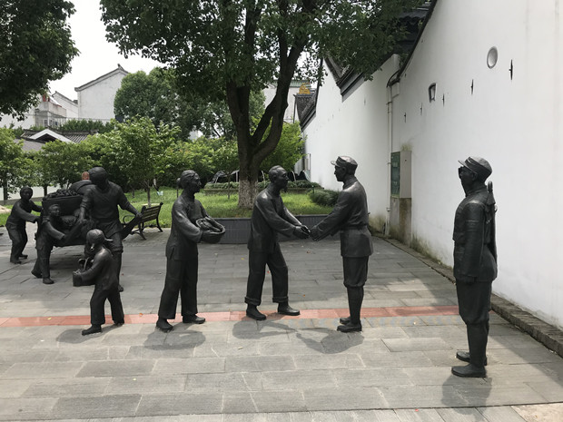 进入纪念馆大门,一块巨大石壁就映入眼帘,石壁上刻着王必成将军的题词:“没有水西村,就没有茅山根据地,就没有东进,就没有苏北根据地,也就没有黄桥战役的胜利!”这句话充分证明了新四军水西指挥部的重要历史作用。在接下来的一个多小时参观时间里,社区党员通过电子模型展品、人物群像雕塑实景成列、革命影片认真学习了新四军江南指挥部的建立过程以及新四军浴血奋战的战斗过程。纪念馆讲解员还为大家认真讲解了新四军艰苦的战斗过程,社区党员们深切感受到陈毅、粟裕同志带领新四军在极端恶劣的环境中创下光辉业绩的来之不易。