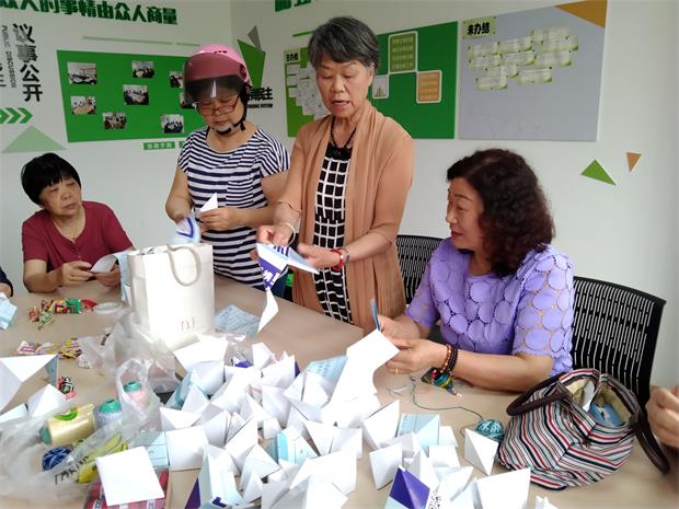 活动开始,志愿者们和社区管家围坐在一起有说有笑,手上还在不停地忙着做香囊。李老师给大家介绍香囊制作方法、制作程序等。随后,大家拿起准备好的材料,对照着样品认真地折纸、上丝线、挂吊坠、上尾须……大家分工合作,制作出了一个个图案各异、色彩斑斓的香囊。最后这些香囊将统一送给社区的孤寡老人和失独家庭。