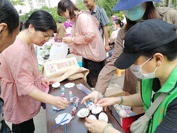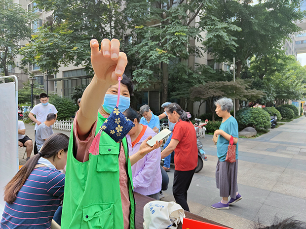 在活动现场,健康体检、义务理发、按摩理疗、法律援助科普宣传等便民服务依旧备受欢迎。另一边,片片粽叶飘飞,一撮撮糯米在手中飞舞,一会时间,一个个粽子就包好了,在包的过程中,邻居们互相交流包粽子技巧,现场有说有笑。本场活动还结合“熟人社区营造计划”开展了的情投一壶、巧手制香囊、绘彩蛋等端午民俗打卡和“好邻居一起来”招募活动,居民们积极打卡,活动现场欢声笑语,充满着浓郁的节日氛围。
