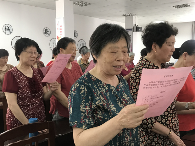 活动分为唱歌曲、学模范、诵经典、发善心、送吉祥等五个环节。在学模范环节中宣讲志愿者为大家讲述了三位社区老党员的故事,并通过视频认识了退休后仍扎根基层23年的社区主任周菊珍(92岁)、当兵期间从事情报工作的宣兴大(84岁)以及参加入朝作战、青海剿匪的老兵杨锁发(83岁)。在随后的诵经典中,大家一起诵读了习近平金典语录,充分认识到为人民服务,结百姓忧难是我们的职责,更是我们的初心使命。