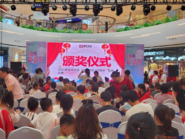 活动现场人头攒动,受纯真的向党童心启发而创作的绘画作品分列在中央大厅两边,极力吸引着过往行人的目光。本次展览通过前期筹备,华丰社区收集六十余幅作品,经过壹号书院老师的专业评审,挑出五十幅作品进行展览,并对这些作品的作者小朋友们进行颁奖。奖项分为创意银奖,创意金奖,优秀银奖和优秀金奖4类。获奖的小朋友们分批次上台领取由华丰社区颁发的荣誉证书和心怡的小礼物。获奖小朋友的家长们则在台下激动地为孩子们鼓掌,拍照拍视频,发朋友圈发抖音留念。最终颁奖仪式在欢快的氛围中结束。